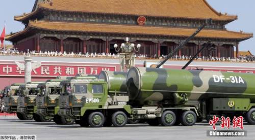 2015年9月3日,中国人民抗日战争暨世界反法西斯战争胜利70周年纪念大会在北京隆重举行。图为东风-31弹道导弹发射车接受检阅。中新网