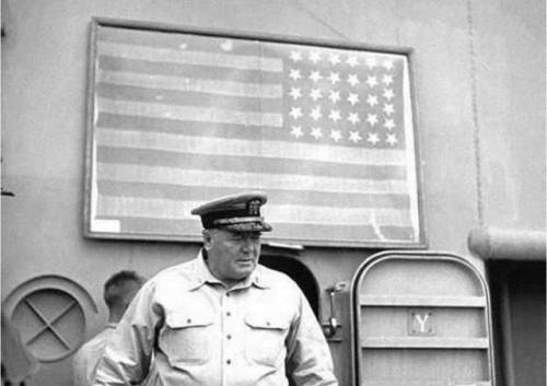 受降仪式中密苏里号上反挂着的美国国旗(佩里国旗),1945年9月2日,美国海军中将约翰·沙弗罗思(John F.Shafroth)走过密苏里号上的佩里国旗。
