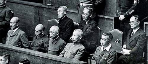 东京审判的甲级战犯,前排左起:东条英机(死刑)、冈敬纯(终身监禁)、梅津美治郎(终身监禁)、荒木贞夫(终身监禁)、武藤章(死刑)。第二排左起:平沼骐一郎(终身监禁)、东乡茂德(有期徒刑20年)、重光葵(有期徒刑7年)朝鲜日报
