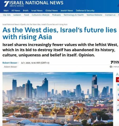 一位以色列学者7月1日发表文章,题目是《随着西方的消亡,以色列的未来将取决于崛起的亚洲》。