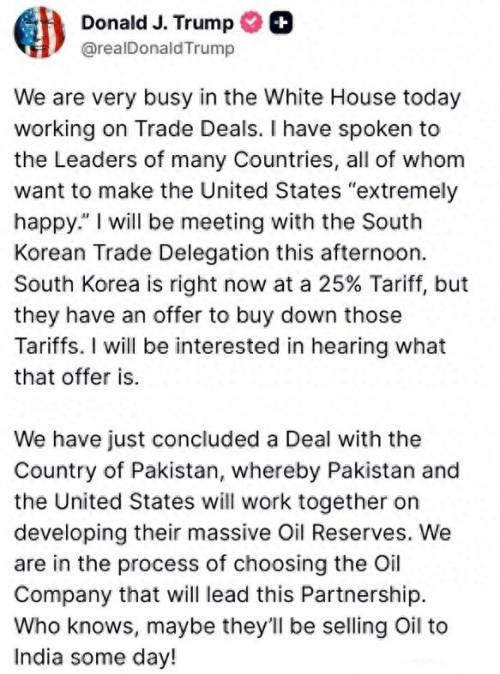 第三次就是这次,因为特朗普还宣称:美国刚刚与巴基斯坦达成协议,巴基斯坦和美国将共同开发其丰富的石油储备。我们正在遴选领导这项合作的石油公司。谁知道呢,也许有一天他们会把石油卖给印度……