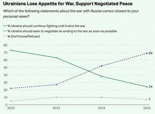 因为大多数乌克兰老百姓赞成通过谈判提前结束战争,有69%的受访者支持这一立场。只有24%的人继续坚持要和俄军打下去,直到完全战胜俄罗斯。