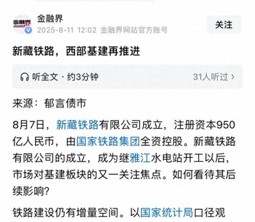8月11日媒体分析了刚刚成立的新藏铁路公司以及新疆到西藏铁路的重要价值。
