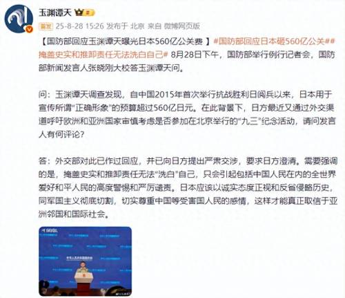 在九三阅兵到来之际,日本通过外交渠道呼吁欧洲和亚洲国家审慎考虑是否参加在北京举行的“九三”纪念活动,而根据玉渊谭天调查发现,自中国2015年首次举行抗战胜利日阅兵以来,日本用于宣传所谓“正确形象”的预算超过560亿日元,花这么多钱,目的就是掩盖史实和推卸责任洗白自己。