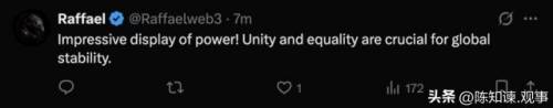 还有网友表示,“令人印象深刻的力量展示!团结和平等对全球稳定至关重要” 。