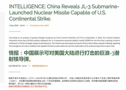 从战略层面分析,《海军新闻》指出,巨浪-3的首次公开展示,标志着中国潜射洲际弹道导弹力量已正式投入作战值班,并具备了可靠的海基二次打击能力。这表明中国不会再保持之前的战略模糊,而是积极迈向可靠的二次打击态势,强调生存力、机动性和有保证的报复能力。