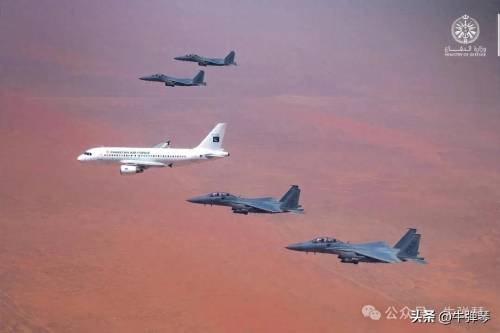 视频和图片显示,夏巴兹专机进入沙特领空后,沙特出动四架战机护航。