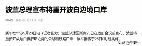 当地时间9月23日,波兰总理图斯克表示,波兰将在9月25日凌晨重新开放与白俄罗斯之间的边境口岸。