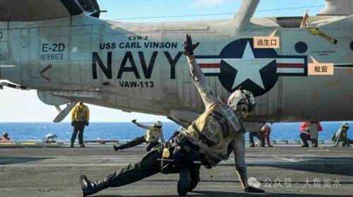 > 2024年7月15日,“卡尔·文森”号准备弹射起飞一架E-2D,一位机组从逃生口伸出手示意准备完毕。