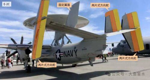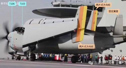 至于为什么两种飞机都只安装3组方向舵而不是4片垂尾上都装,而且位置相反,是因为内侧垂尾上的方向舵主要不用于控制航向,而是为了抵消同向旋转的2具螺旋桨产生的偏航扭矩,所以只需设置在一侧就能满足要求。E-2螺旋桨为逆时针旋转,方向舵在左侧,空警-600螺旋桨为顺时针旋转,方向舵在右侧。