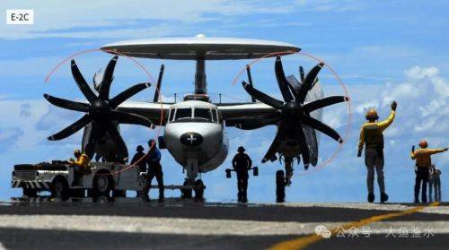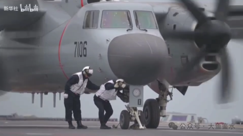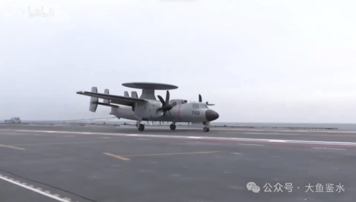 从舰艏方向看滑行中的7103号机,舰岛后侧可以看到第3架7104号机,这里是美国航母通常停放预警机的位置。加上前面的7106号机,此时甲板上只有3架空警-600,说明是在进行空警-600的起降作业专项测试。可以看到空警-600螺旋桨转动的方向(朝桨叶的“刀刃”方向转)是顺时针,下图E-2C是逆时针。