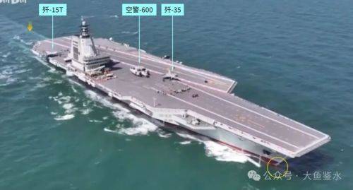 此时前甲板弹射器后面只有歼-35和空警-600,歼-15T停放在后甲板上。