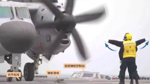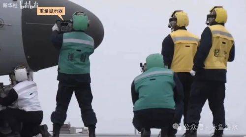 旁边的弹射面板操作员(黄马甲)通过对讲机向全体参与弹射的人员发出指令:“二号位最后准备。”旁边一人汇报:“负载好,装置好。”(疑似,听得不太清楚)