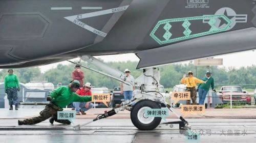 > 进行地面弹射测试的F-35C前轮结构,不同机型采用不同颜色的限位杆加以区分。牵引杆前端涂有指示性的黑漆,当挂入黑色弹射滑块前端的凹槽时,底部的弧度和弹射滑块顶部形状相同,如果连接后露出了下面的白漆说明挂钩位置不正确,我们的牵引杆上没看到这个简单但实用的设计。