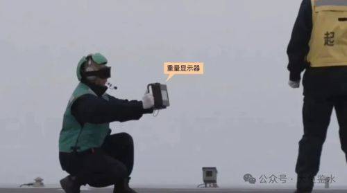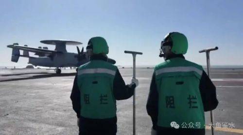 上图最前面2名黄马甲是弹射指挥员(央视记者解说叫起飞助理),绿马甲是弹射操作员,蹲在前起落架旁的是安全检查员。最引人注目的是左边这位绿马甲,他手里拿着的是重量显示器,向飞行员显示起飞重量(画面中反拿重量数据面向他自己)。读数似乎是032,单位为吨?如果是这个重量的话就有点夸张了,E-2D最大起飞重量是26吨。
