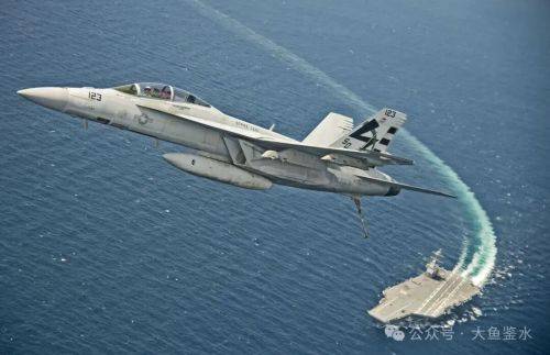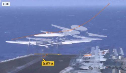 以E-2C顶部的CEC天线座为基点连线,在飞越甲板前端时飞机明显有一个下跌的动作,主轮高度几乎和甲板平行,然后再向右侧偏转爬升,显得较吃力。看了好几个E-2弹射的视频基本都是这样。