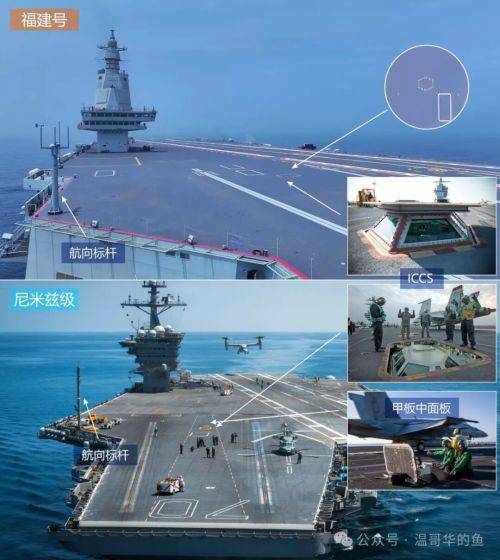 “福建”舰和福特级一样设有两座,一座在1、2号弹射器末端之间,另一座在左舷中部助降镜之后,不同的是“福建”舰的舷侧控制室只负责3号弹射器,福特级则负责舷侧3、4号弹射器。尼米兹级两处除了ICCS还各有一个开敞式的弹射控制面板,供晴天式露天控制弹射器(参见图说闽渔18号(上))。