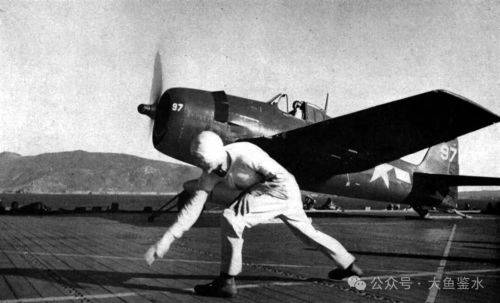 (视频的顺序有点乱,把这3张图提前讲)黄马甲是尾钩观察员,他站在触舰点附近,高举双手示意挂钩成功。如果发生脱钩或者阻拦索被拉断等意外情况,他可以在最近距离内观察到并发出报警手势,左侧LSO平台上的着舰信号官将立即发出复飞信号,飞行员打开加力拉起飞机。