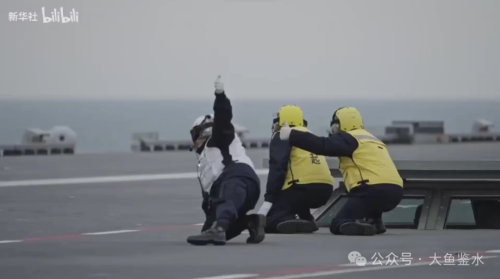 甲板上白马甲安全观察员以侧身蹲踞的姿势举起大拇指示意准备完毕,前面两位黄马甲是起飞助手,前面一人单手指向前方打出“走起”手势,示意启动弹射器。