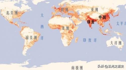 世界人口密度图,颜色越深,人口密度越高,反之越低