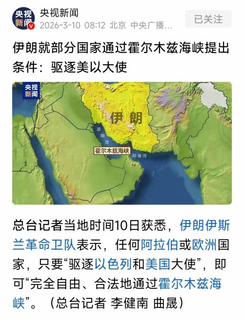 所以接下来的事情就有点好玩了,3月10日,伊朗伊斯兰革命卫队表示,任何阿拉伯或欧洲国家,只要“驱逐以色列和美国大使”,即可“完全自由、合法地通过霍尔木兹海峡”。这个风格比较像,革命卫队的操作差不多能玩出这一招,不就是相互恶心嘛,谁不会啊!