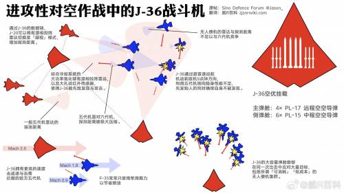 巡航高度与速度以及航程:该机或能在60000英尺(1.8万米)高空巡航,这个高度投射防区外武器时射程很远;宽大的机体拥有大内油空间,作者泰勒认为该机可能拥有2000英里(3200公里)的作战半径,能直接威胁关岛;从此前发表的论文推测,DSI进气道最佳巡航是1.5马赫,可以认为歼-36能全程以1.5马赫巡航,但最高巡航速度未知,推测应该超过2马赫;