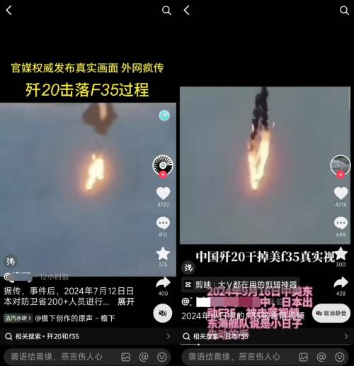 为了“佐证”消息的真实性,有自媒体还公布了所谓击落F35战机的空战视频,乍一看,有图有真相,歼-20击落F-35似乎已经板上钉钉了,又有自媒体开始“发散思维”,将近期中国军事代表团访问日本一事,和“F-35被击落”扯到了一块,宣称日本被“打疼”了,200多名防卫省人员被处分,自卫队防卫长官黯然辞职,随后更是主动示好,邀请解放军来做客云云,末了还不忘感慨一句:果然只有强者才会受到尊重。果不其然,不明真相的网民们纷纷点赞,好好地抒发了一把爱国热情。