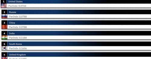 按照知名军事网站《全球火力网》(globalfirepower)的最新排名,即便俄罗斯在俄乌战场上的表现相对拉跨,但还是继续排在全球第二的位置,但这里需要提一嘴的是,今年我国的军事实力指数已经和俄罗斯持平,这显然也是考虑到了俄军的实战表现。