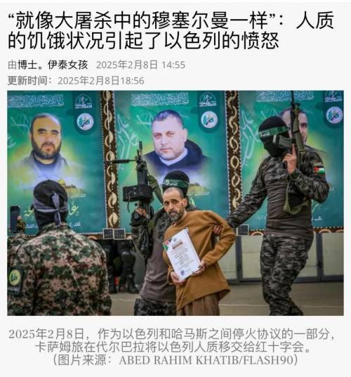 2月8日,按照人质交换协议的规定日期,哈马斯释放了三名男性人质。但是当这三名人质出现在媒体画面当中时,整个以色列都震惊了。原因在于他们非常瘦弱,甚至被视为是饿到了皮包骨。因为和他们之前的照片对比来看,他们的体重至少下降了30%~50%。