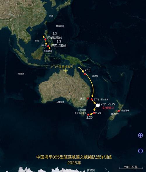 中国海军055型大型驱逐舰“遵义”舰所领衔的驱护舰编队,此次从南海出发,一路南下最终抵达澳大利亚以东、新西兰以西的国际公海水域,并在塔斯曼海附近展开多轮实弹射击演练。