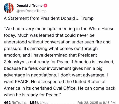 泽连斯基离开后不久,当地时间两点多,特朗普就在网上发布了总统声明: