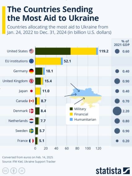 从2022年1月24日(战争爆发前夜,美欧已经因为战云密布而增加对乌克兰的援助)到2024年12月31日为止,美国援助共计1192亿美元,欧盟521亿美元,德国181亿美元,英国154亿美元,丹麦84亿美元,荷兰77亿美元,瑞典57亿美元,法国51亿美元。欧洲的援助总额与美国大体相当。