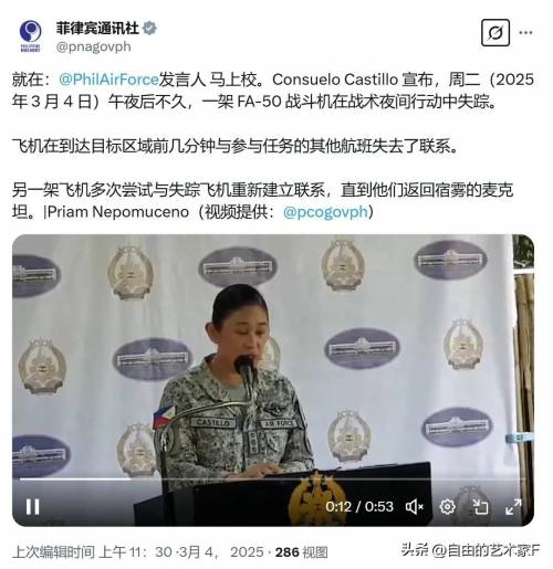 3月4日菲律宾空军发言人马上校发布声明表示,称在3月4日凌晨,菲律宾空军1架FA-50战斗机在战术夜间行动中失联。