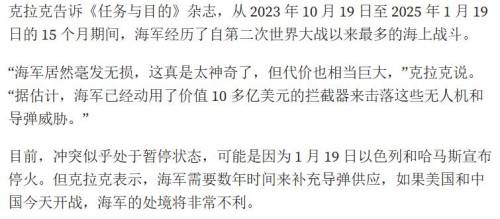 据称,仅仅是这15个月,美国消耗了120枚标准2、80枚标准-6、20枚海麻雀,一共发射了400枚各型导弹及炮弹,到 2024 年中期的时候,因为导弹消耗太快,加上红海比较狭窄,部分情况下,胡塞的无人机突破到了距离美航母太近的地方,因为射击距离太近等因素无法使用大型导弹,美国海军用上了成本较低的“响尾蛇”和“地狱火”导弹。在航母战斗群回到美国后,海军部长也在任命听证会上承认了弹药短缺的问题。胡塞很好地测试了美国。