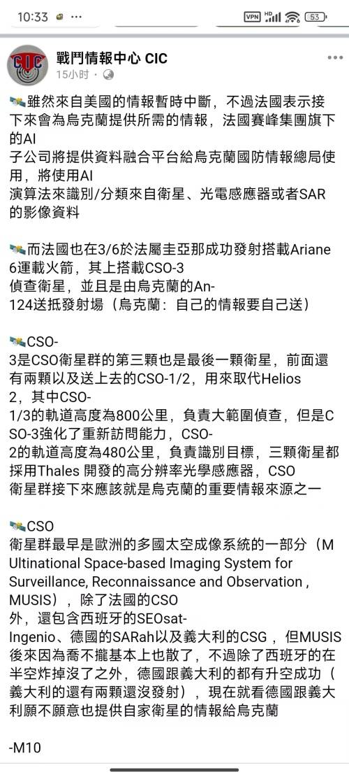 虽然来自美国的情报暂时中断,法国政府表示接下来会为乌克兰提供所需的情报,法国赛峰集团旗下的公司将提供资料融合平台给乌克兰情报总局使用,同时在3月日发射的运载火箭上搭载的侦查卫星将利用高分辨率光学感器位乌克兰提供及时的情报来源。