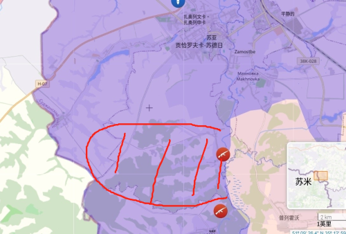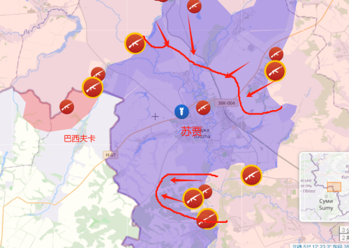 根据目前最新的俄军方面的前线报道,这两天俄军在苏贾的南部地区已经从库里洛夫卡出发长驱10多公里,基本切断了乌军的次补给线38H-609公路。俄军在苏贾的西部地区越过国境线在苏梅地区进行推进,俄罗斯军队攻下了苏梅州的茹拉夫卡和诺伊维奇,俄军距离物理完全切断乌军最后退路38-004公路只剩下一个村子—巴西夫卡。俄军在苏贾的东北部地区拿下区域中心马丁诺夫卡,基本上全部吃掉了乌军苏贾东北部。而俄军在猛攻西北部的小洛克尼亚,有消息报道称乌军准备放弃包含小洛克尼亚在内整个苏贾北部地区,退守苏贾一线。