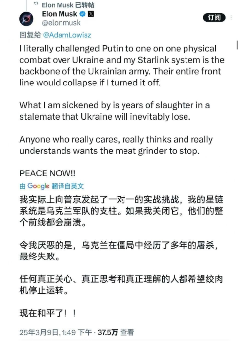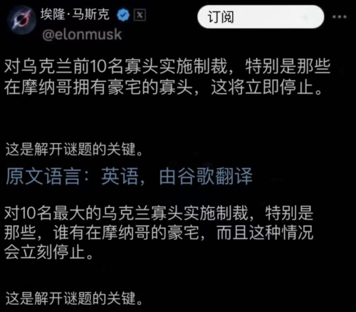 马斯克在3月9日称我实际上向普京发起了一对一的实战挑战,我的星链系统是乌克兰军队的支柱。如果我关闭它,他们的整个前线都会崩溃。令我厌恶的是,乌克兰在僵局中经历了多年的屠杀,最终失败。任何真正关心、真正思考和真正理解的人都希望绞肉机停止运转。现在和平了!与此同时,马斯克继续发推表示对乌克兰前10名寡头实施制裁,特别是那些在摩纳哥拥有豪宅的寡头,战争将立即停止。