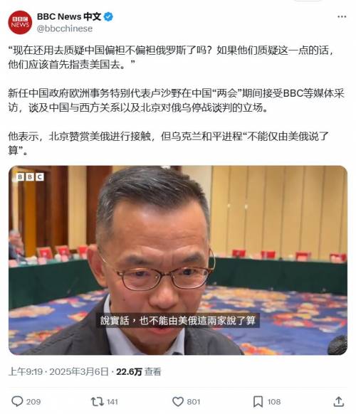 其实只要仔细观察BBC放出来的它们对卢沙野的采访视频就不难发现,它们展示给受众的内容,基本上都是欧盟自己希望看到、同时也希望世人能这么想的。比如卢沙野后来说的那句:“乌克兰问题的和平解决进程……必须得到所有当事方和利益攸关者的参与……不能由美俄这两家说了算,至少欧洲方面它就很有意见。”这句话我想应该是说到欧洲人的心坎里了,算是欧洲人在过去两个月来,在俄乌问题上,从一个世界级大国的高官嘴里听到的最顺耳的一句。