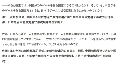 答:“非也非也,其实我们日本也可以参与游戏规则的制定。在当今世界上,能够构建游戏规则的国家只有四个:日、美、中、俄。而这四个国家之间还存在竞争关系。因此,任何一方都无法单独制定游戏规则。相互妥协是必须的,因为只有这样,这场四国同桌的‘大国游戏’才能玩得下去。”