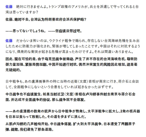 佐藤优:“为什么你会那么在意‘不惜采取非和平手段’这个说法?说到底不就是因为有人在反复炒作‘台海就是下一个俄乌’的议题,而你又被套路进去了吗?”