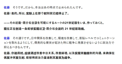 “依您之见,当年的中日全面战争本来是可以被制止的——前提是日本肯见好就收?那么如果以史为鉴,现在日本的当务之急,是不是就是应该尽快和中国建立起一条21世纪的‘近卫文O-蒋介石’沟通渠道呢?”