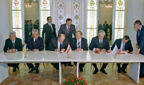 别洛韦日森林的猎人小屋里,鹰视狼顾的乌克兰领导人克拉夫丘克和醉眼朦胧的俄罗斯领导人叶利钦最终决定了苏联的解体命运,史学家将苏联解体的最大原因归结为在联盟内部大哥俄罗斯与二哥乌克兰的矛盾,是乌克兰不愿与俄罗斯同处一个联盟最终导致了苏联的解体。
