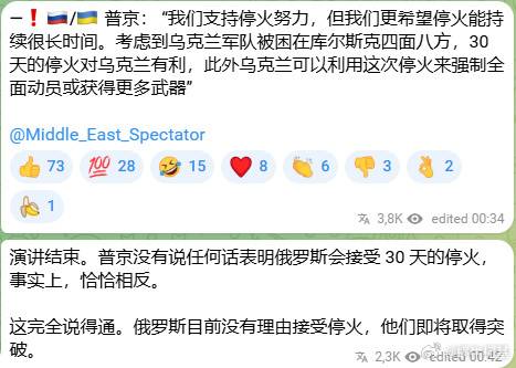 演讲结束。普京没有说任何话表明俄罗斯会接受 30 天的停火,事实上,恰恰相反,俄罗斯目前没有理由接受停火,他们即将取得突破。