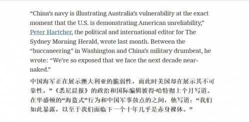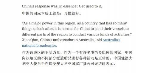 本来肖千这个回答的暴击伤害就够高的了,但这还不是最扎心的,比中国大使的直言不讳更令澳大利亚人感到难绷的,是美国政府对于这件事情的一语不发。文章援引《悉尼先驱晨报》政治与国际版主编彼得·哈彻(peter Hartcher)的话称,“中国海军揭示了澳大利亚的脆弱性,而美国则暴露了其不可靠性。前有美国饿虎,后有中国豺狼,我们澳大利亚夹在它们之间,无异于小儿怀金过市。未来10年,我们的国防安全都将近乎裸奔。”