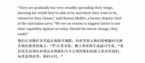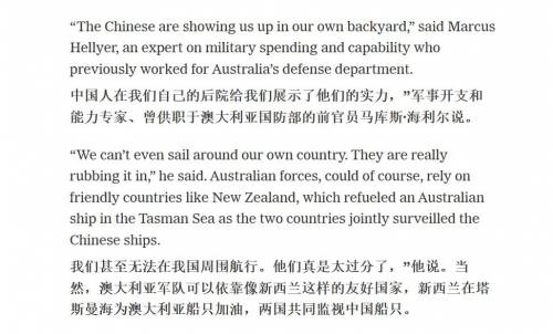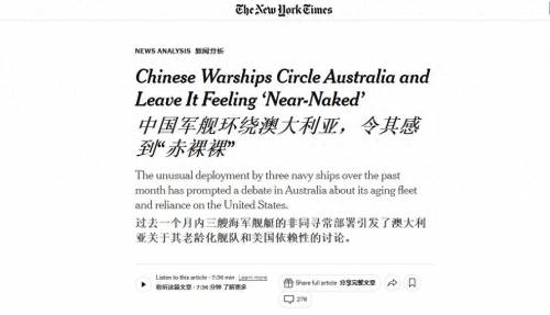 当地时间3月12日,《纽约时报》刊登了一篇题为《中国军舰环澳航行震撼澳大利亚,澳方在中国面前感觉“形同裸奔”》的文章,文章援引澳大利亚海军前副司令罗恩·莫菲特(Rowan Moffitt)的话称,“中国海军正稳步扩展自己的势力范围,向世界展示其有能力随时向任何地点投送兵力。虽然目前我们尚未看到中国海军有流露出想把我们一口吞掉的意图,但一旦中国哪天回心转意,他们完全有那个能力。”