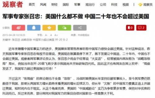 2015年,张召忠在央视节目中抛出一个震撼观点:“就算美国躺着不动20年,中国也追不上。”