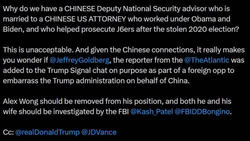 著名右翼媒体人Laura Loomer这几天就给黄之瀚做了个背景调查,在网上声称他的华人老婆曾经在民主党任职,还参与了指控国会山暴乱者,显然是MAGA的敌人。而黄之瀚的岳父更是与中国政府有联系……所以Loomer最后痛心疾首,连着用了好几个大写的“CHINESE”强调重点:一个政治不过关的中国人,怎么能做美国的国家安全助理?