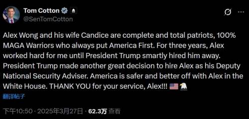 所以Loomer这一通抓内奸,吓得曾经跟黄之瀚工作过好几年的铁杆反华派汤姆·科顿都赶紧出来表态,认证黄之瀚是百分百的良民、百分百的MAGA战士,特朗普大统领亲自挑选的得力干将,不要质疑他的美国魂。