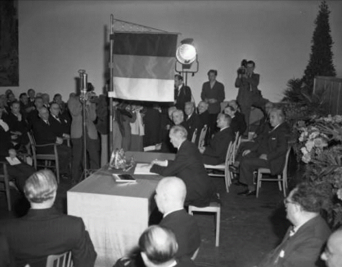 1949年5月23日,康拉德·阿登纳在波恩签署通过德意志联邦共和国《基本法》,他随即就任首位西德总理