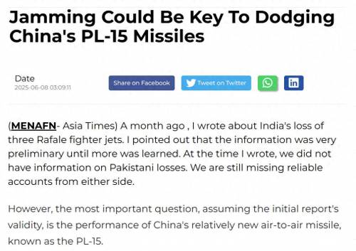 距离印巴空战已经过去一个多月,但围绕空战的故事还没结束。近日美国前五角大楼军官史蒂芬·布莱恩,兴奋的对外界表示,已经找到了霹雳-15的弱点——“苏-30MKI和‘阵风’搭载的电子干扰设备,成功干扰了多达八枚霹雳-15,这证明霹雳-15的抗电子干扰能力较差,印度获得的多枚霹雳-15残骸就是证据。”